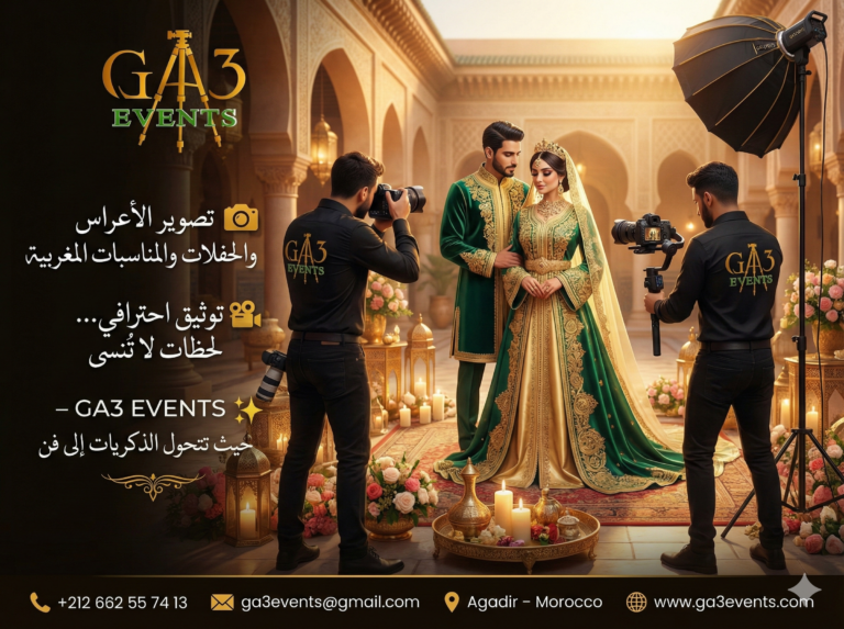 Ste GA3 EVENTS is a professional event photography and videography company based in Agadir, Morocco. We specialize in capturing unforgettable moments through high-quality photography, cinematic video production, and stunning aerial drone shots.